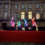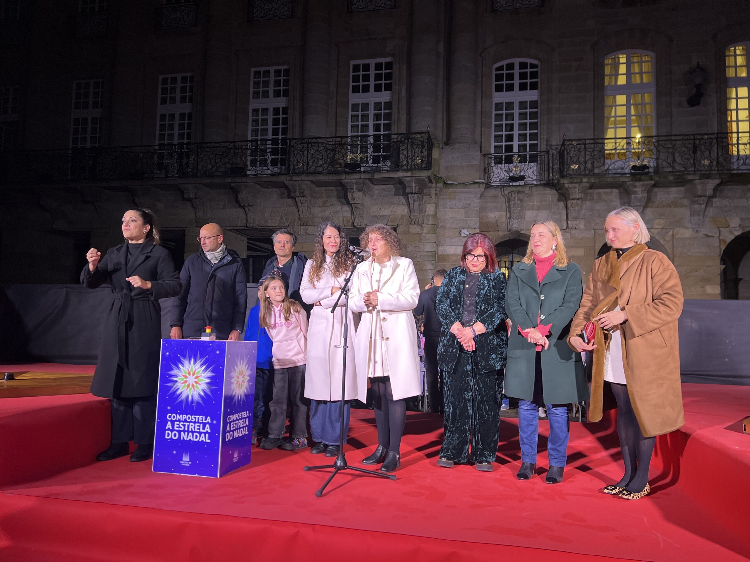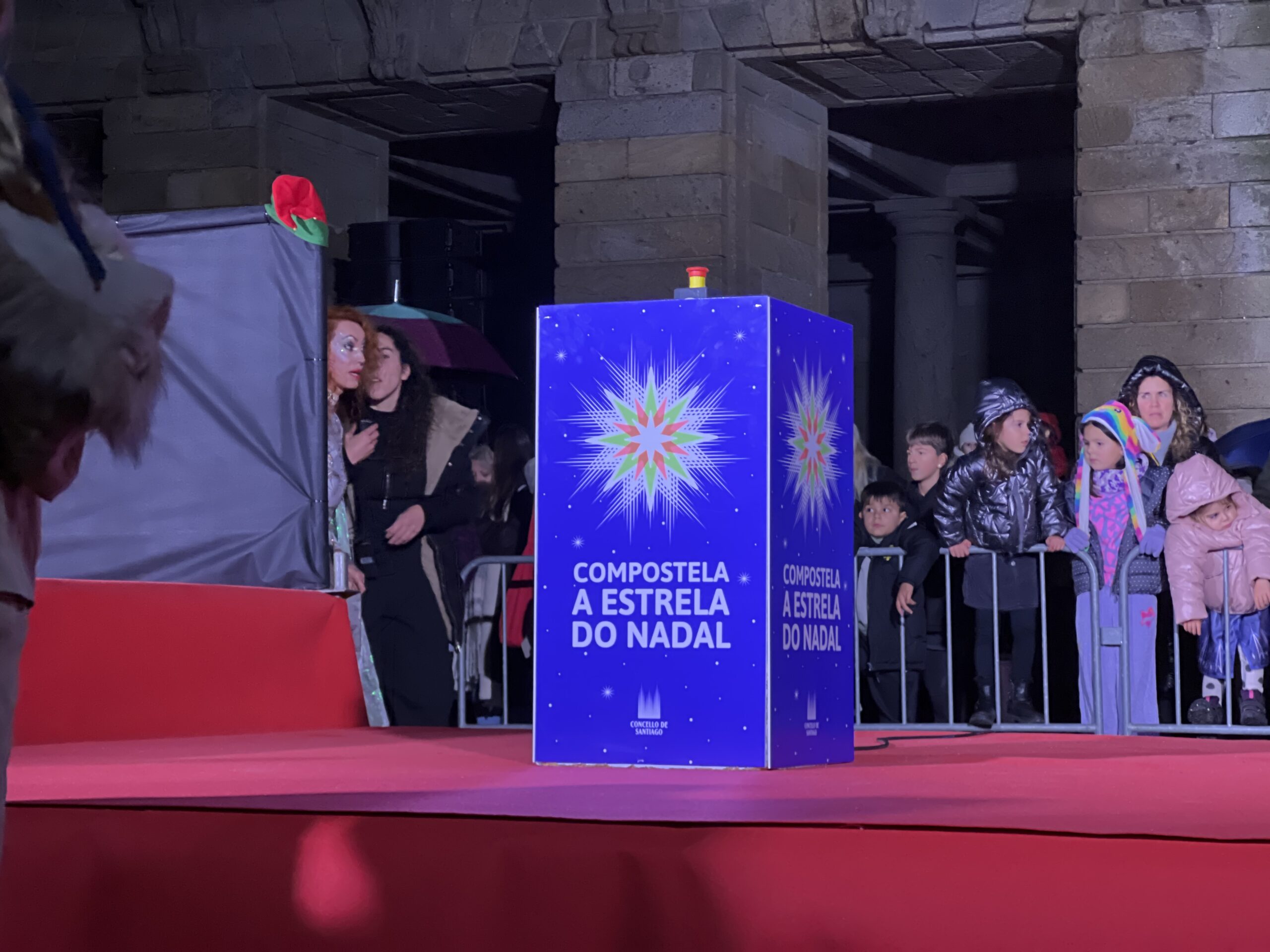 Xa na praza, completamente chea, desenvolveuse un espectáculo previo de malabares e acrobacias, que serviu de antesala ao momento central da xornada. Dous nenos foron os encargados de premer o botón de acendido, tras unha conta atrás dirixida pola alcaldesa. Despois, a rexedora dirixiuse aos asistentes para desexar unhas boas festas, mentres o brillo da nova iluminación inundaba a fachada do Pazo de Raxoi.