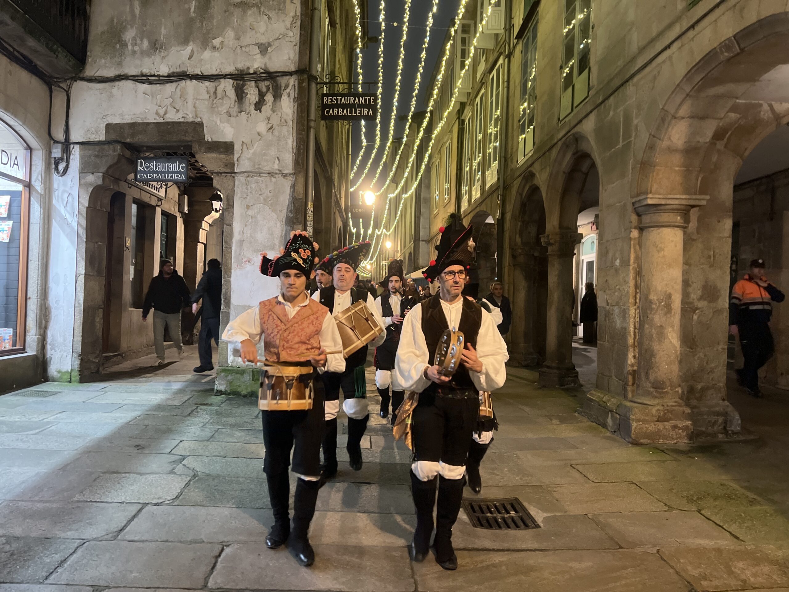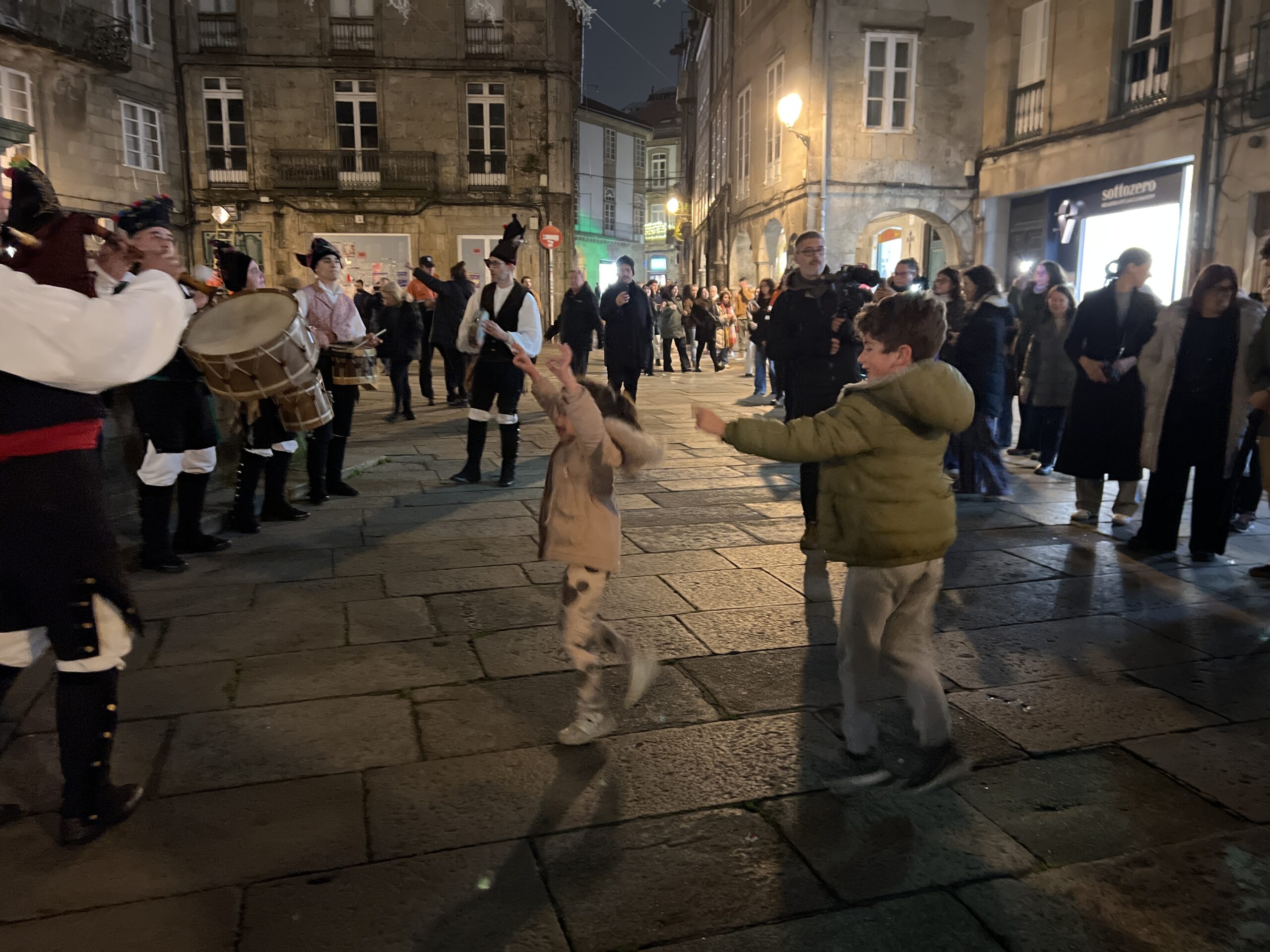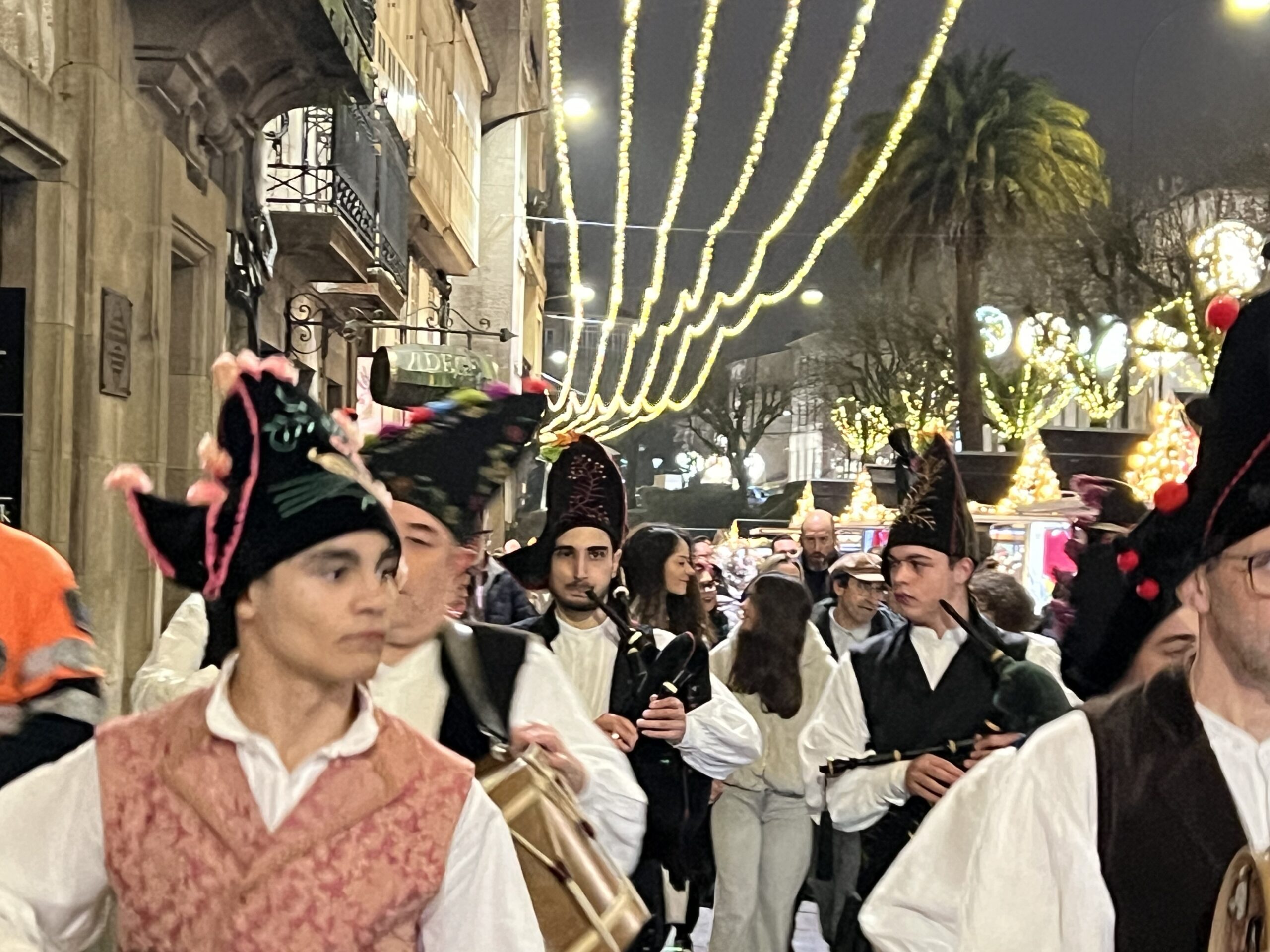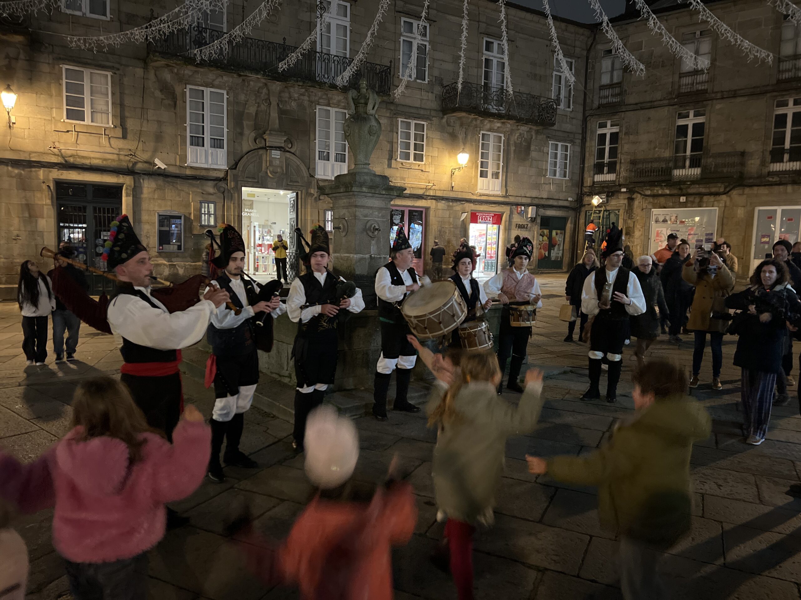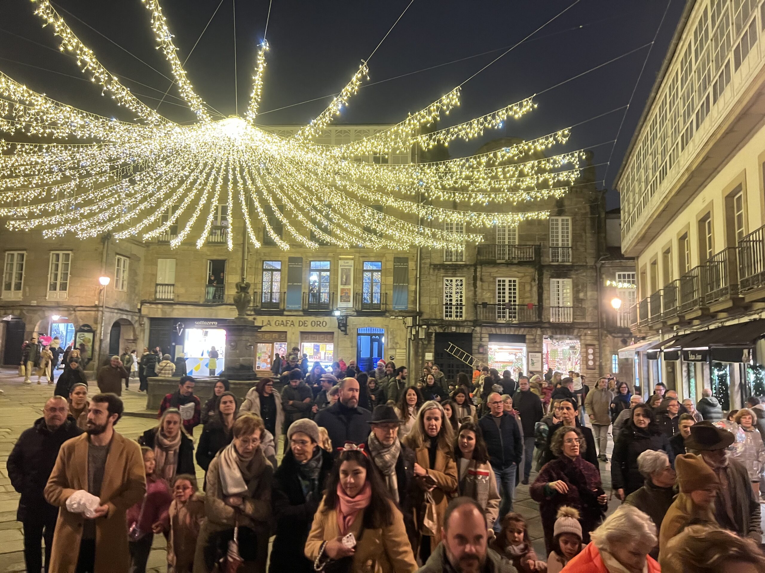 O acendido oficial das luces de Nadal de Santiago celebrouse este venres cunha gran participación cidadá e cun percorrido festivo que levou a comitiva municipal desde a Carreira do Conde ata a praza do Obradoiro. A corporación municipal iniciou o acto cun pequeno desfile acompañado dun grupo de gaiteiros, que encabezaron a marcha polas principais rúas do centro histórico.
