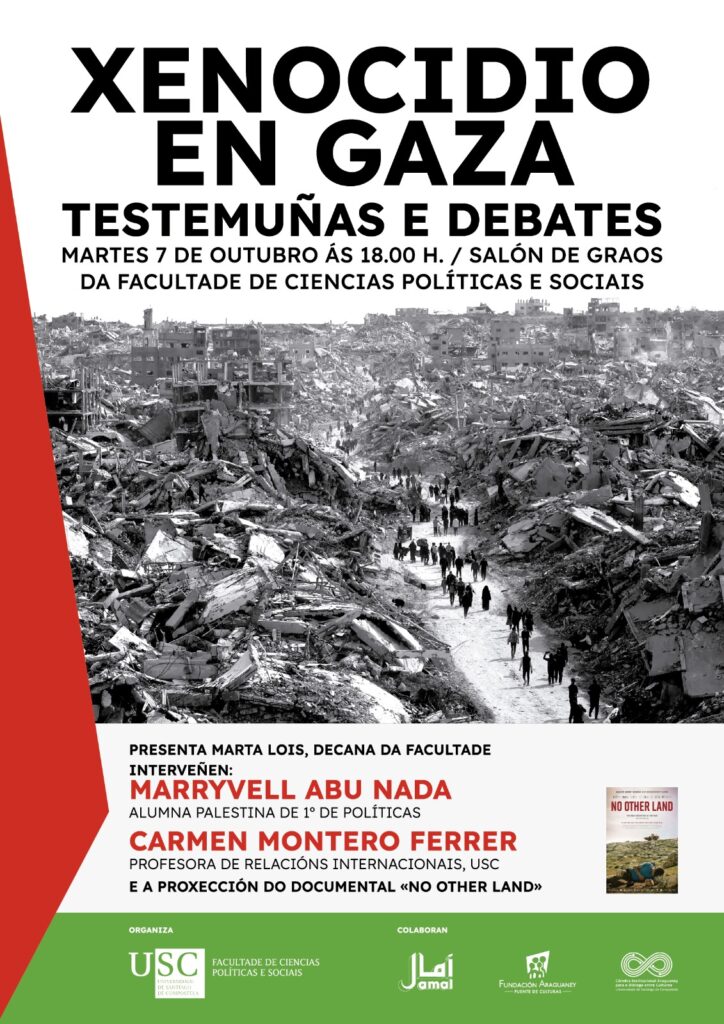 A Facultade de Ciencias Políticas e Sociais da Universidade de Santiago de Compostela acollerá o vindeiro martes, 7 de outubro, ás 18:00 unha xornada titulada ‘Xenocidio en Gaza. Testemuñas e Debates’. A actividade conta coa colaboración da Fundación Araguaney-Puente de Culturas, a través da Cátedra USC – Araguaney para o Diálogo entre Culturas.