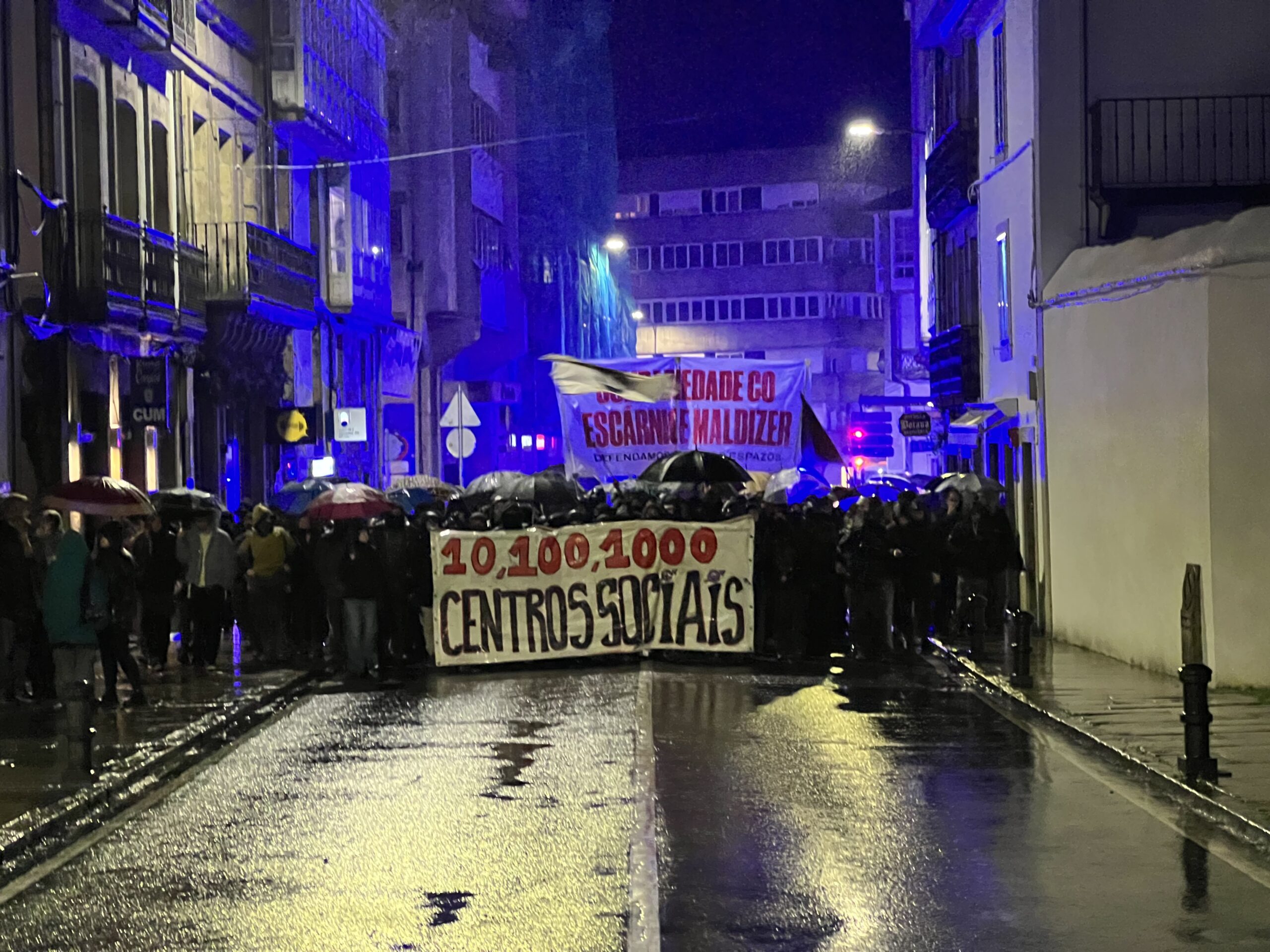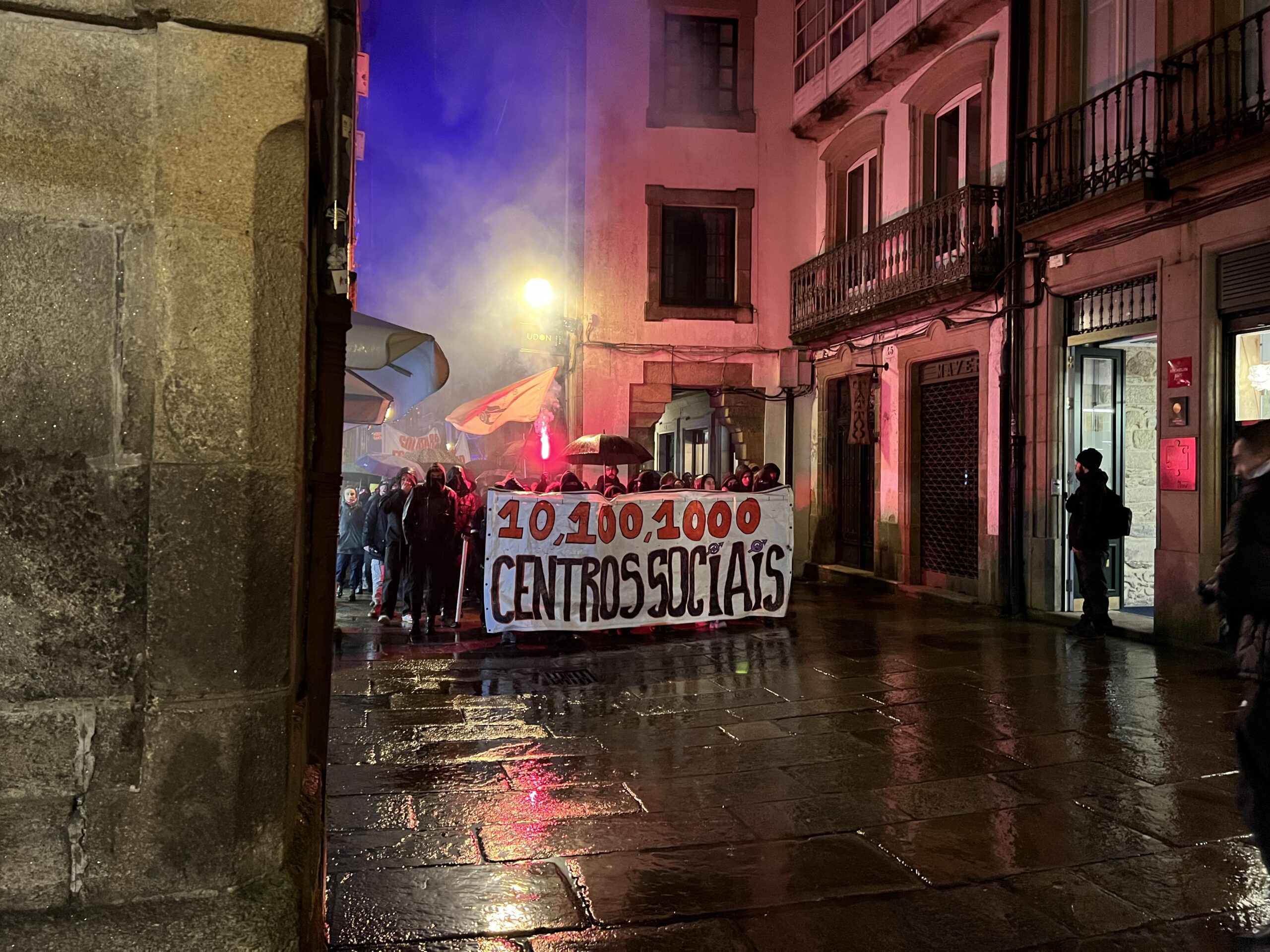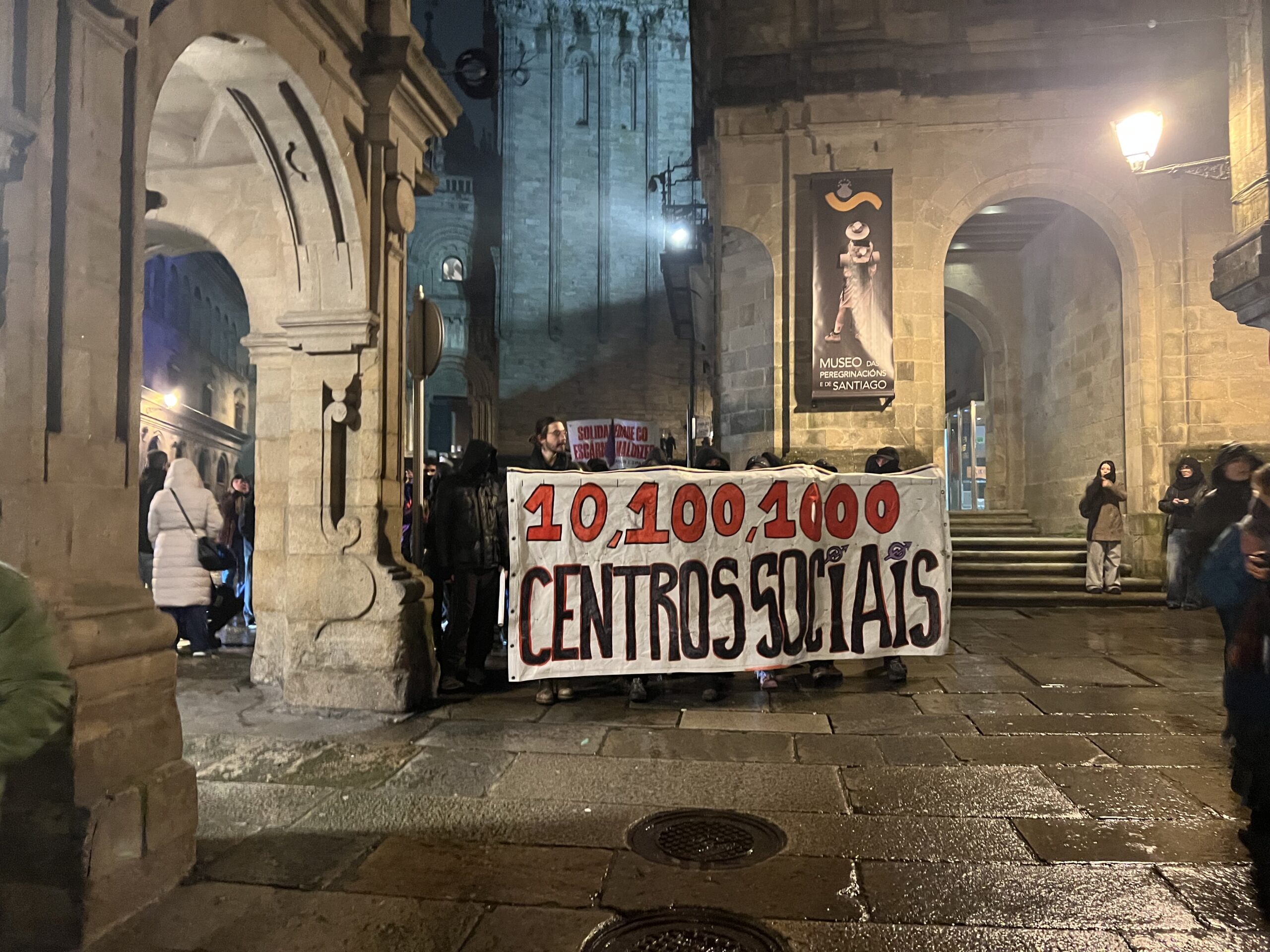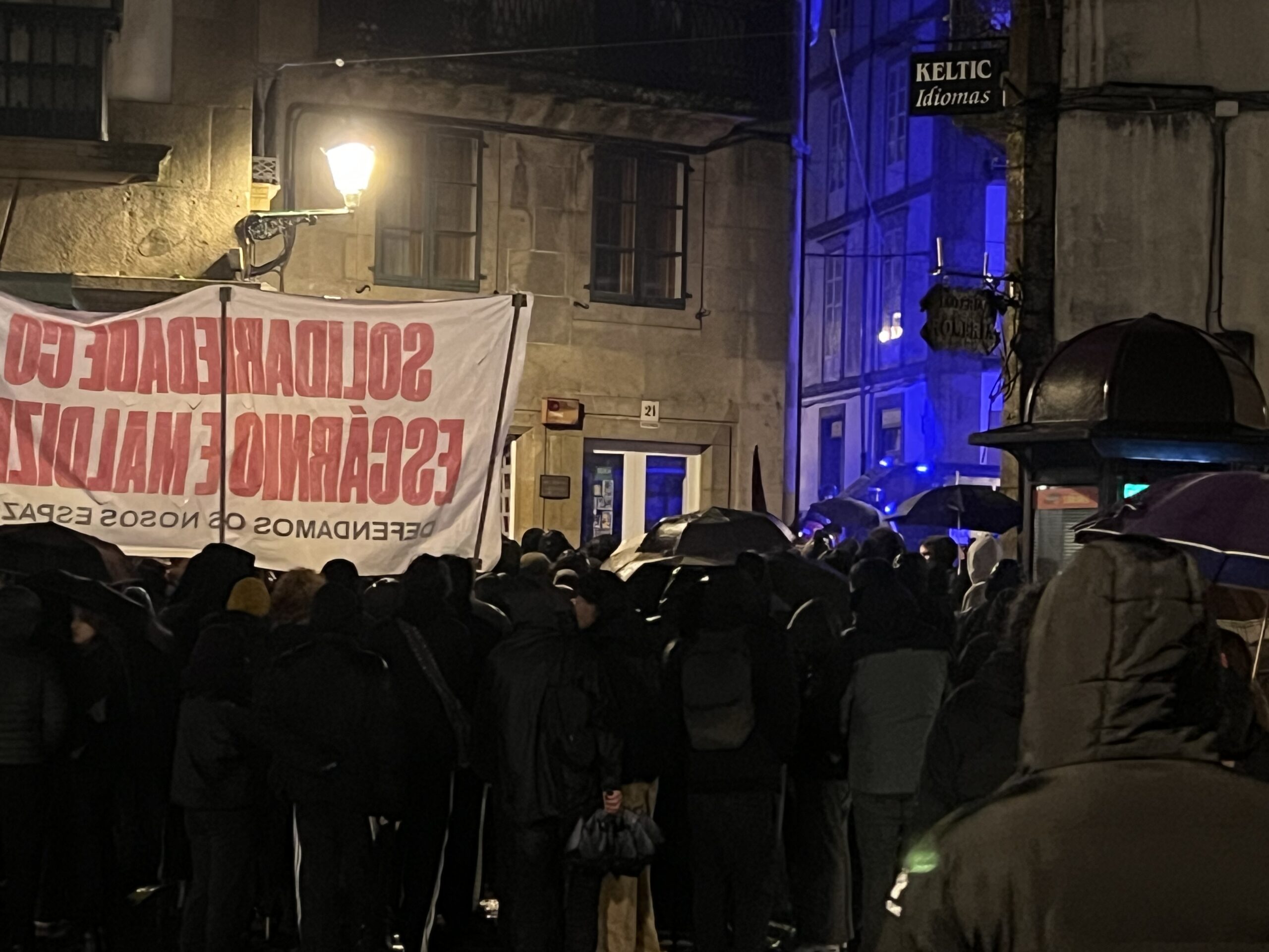 As protestas polo desaloxo do centro social ‘Escarnio e Maldizer’, situado na rúa Algalia de Arriba, continuaron este venres pola tarde no centro histórico de Santiago. A mobilización comezou ás 20:00 cunha concentración inicial na Praza de Cervantes, dende onde partiu unha manifestación que percorreu distintas rúas e prazas da zona vella e do Ensanche.