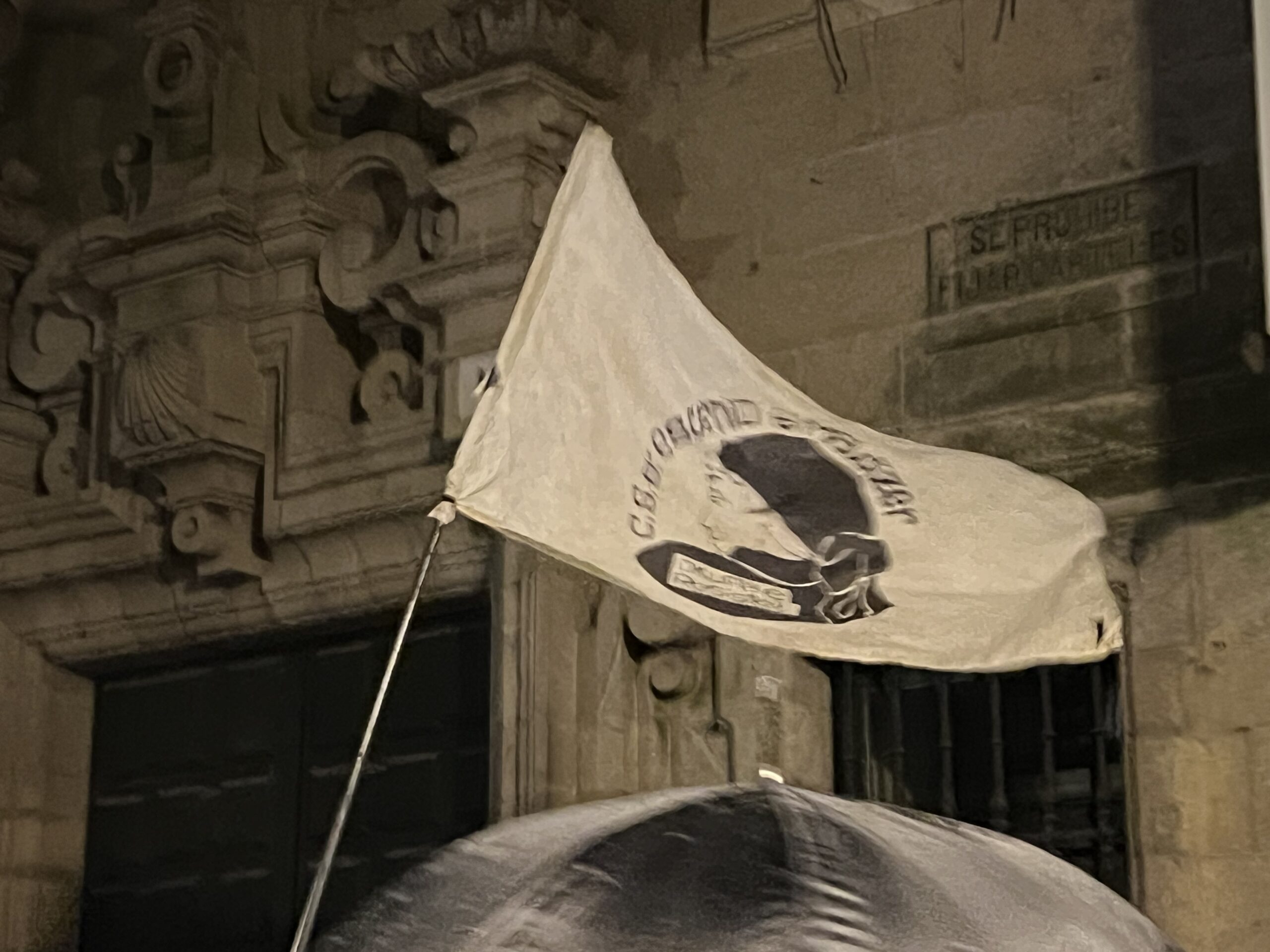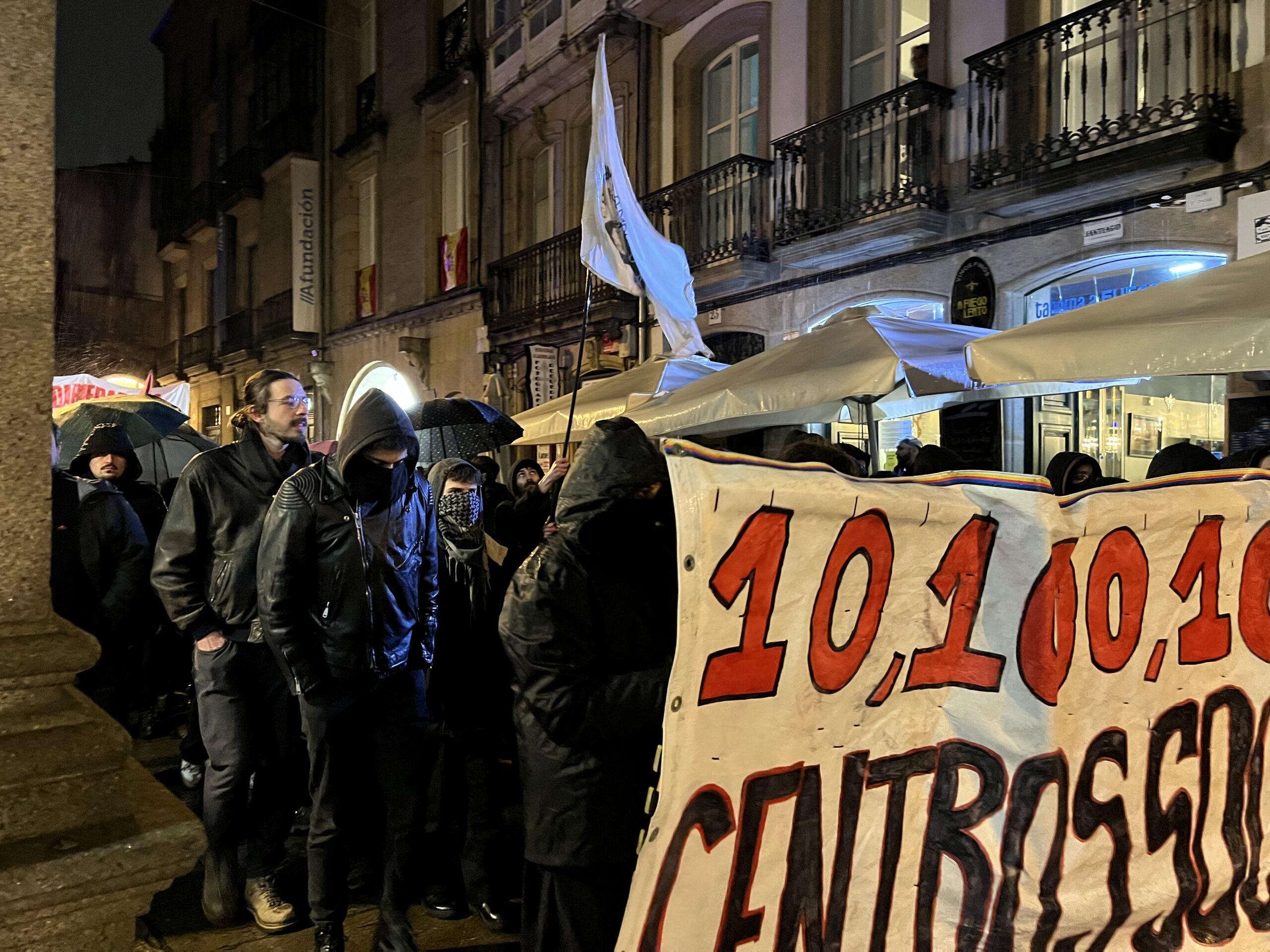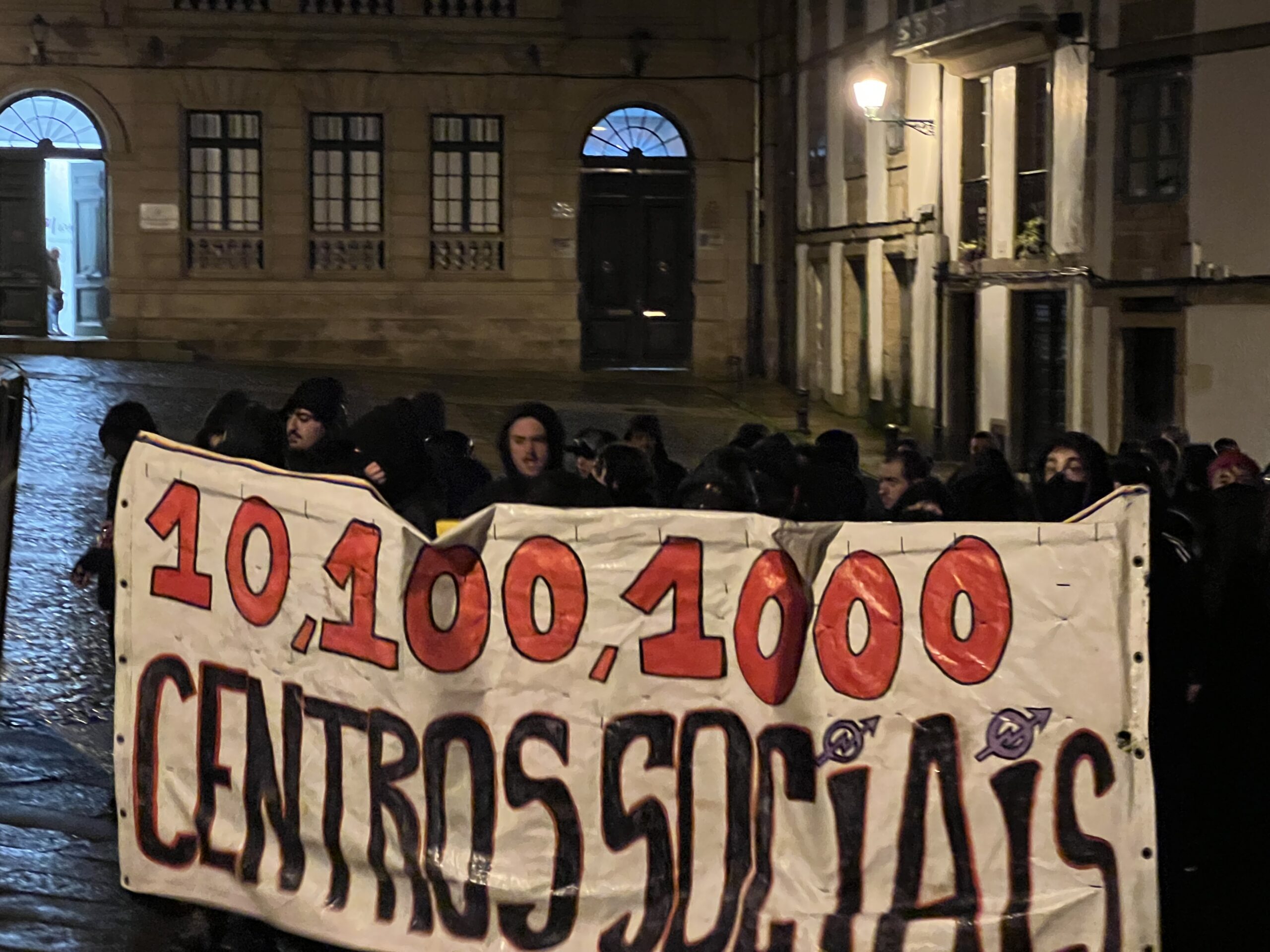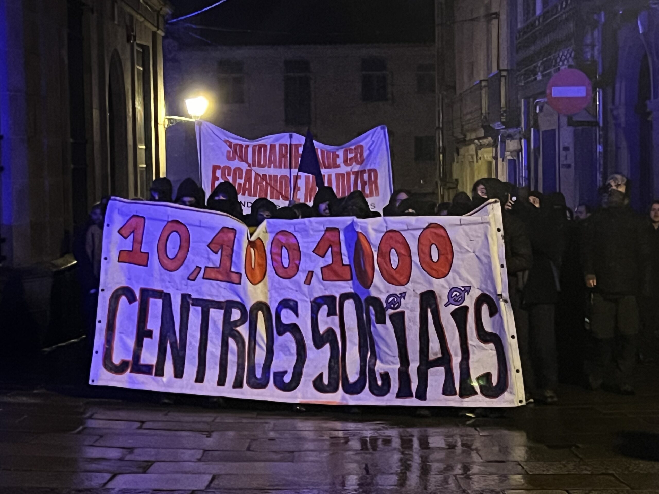 As protestas polo desaloxo do centro social ‘Escarnio e Maldizer’, situado na rúa Algalia de Arriba, continuaron este venres pola tarde no centro histórico de Santiago. A mobilización comezou ás 20:00 cunha concentración inicial na Praza de Cervantes, dende onde partiu unha manifestación que percorreu distintas rúas e prazas da zona vella e do Ensanche.