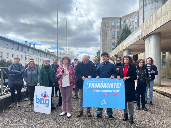 O Bloque Nacionalista Galego celebrou este xoves unha concentración diante dos xulgados de Fontiñas, en Santiago de Compostela, para animar á cidadanía a recuperar os nomes e apelidos na súa forma galega. O acto, convocado ás 12:30, reuniu militantes e simpatizantes da formación nacionalista e contou coa participación da alcaldesa compostelá, Goretti Sanmartín Rei, que fixo un chamamento a impulsar esta iniciativa como forma de reivindicación lingüística e identitaria.
